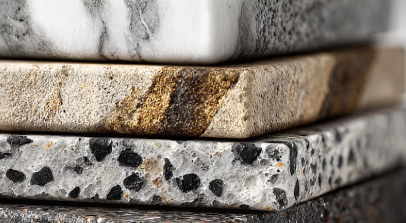 Бывает нескольких видов. Акриловый — лёгкий, тёплый на ощупь, легко поддаётся ремонту и полировке. Кварцевый агломерат отличается высокой прочностью и устойчивостью к царапинам. Полимербетон и жидкий камень применяются для литых изделий. Каждый тип подбирают в зависимости от назначения и дизайна.