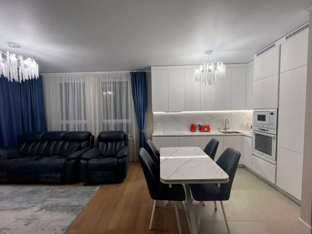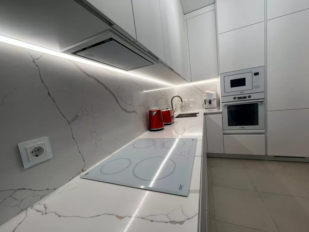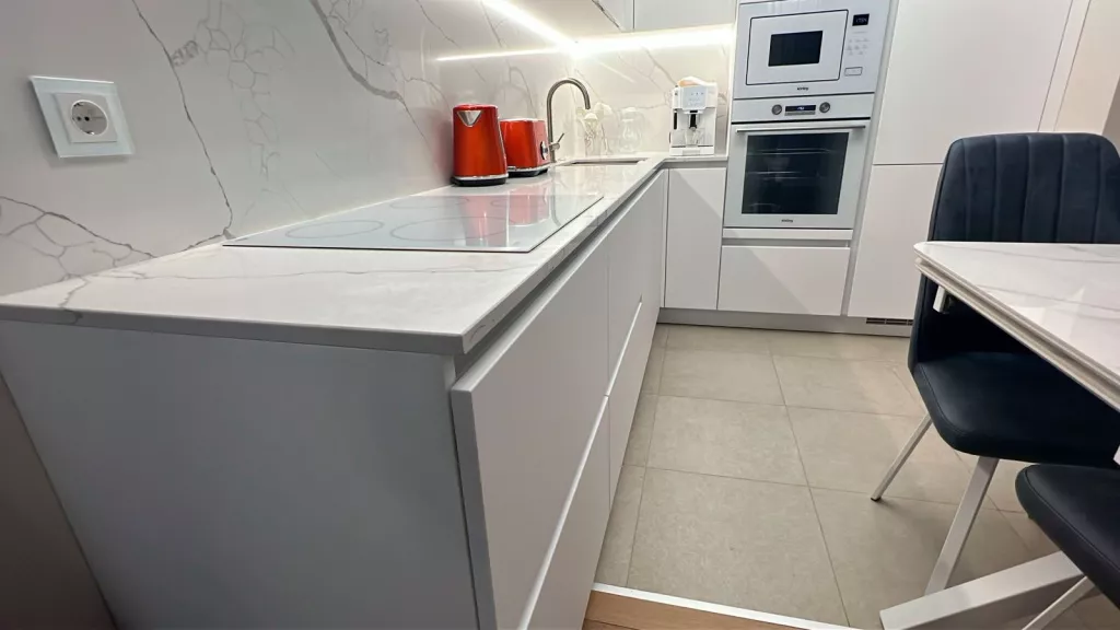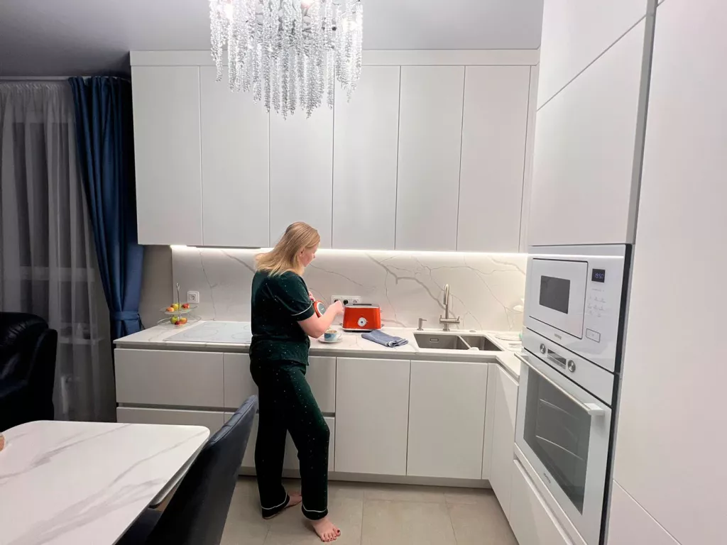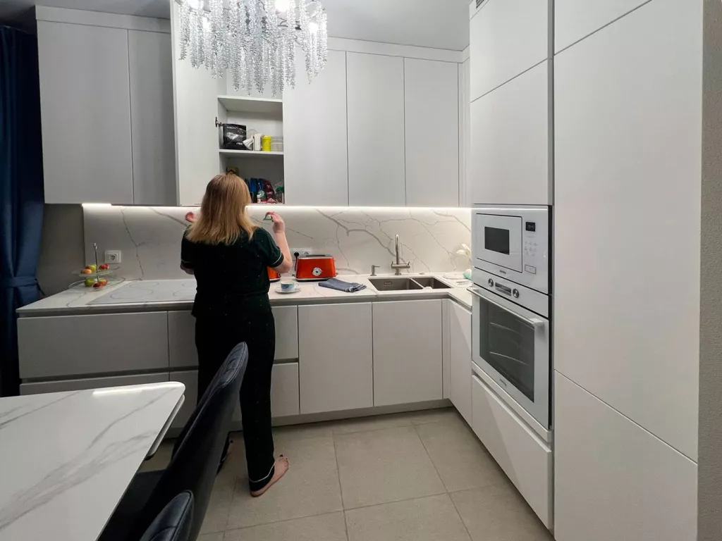 Кухня у нас стоит уже два месяца, и я вижу, какая она умопомрачительная. Я уже не вижу шовчик на стене из кварца — я вижу красоту. Белоснежные фасады, белоснежная техника. Я купила стеклянные розетки. Подсветку сделали такую, что зажигается от движения руки. Я повесила хрустальную люстру со множеством лампочек, она подсвечивает кухню, и эмаль выглядит просто непередаваемо нарядно.