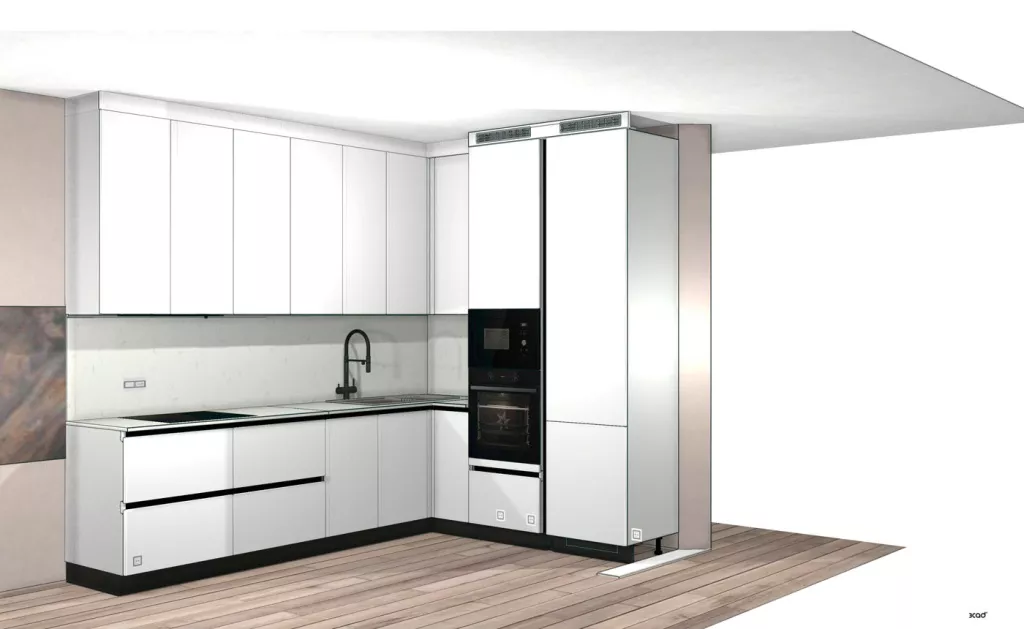 На кварцевый агломерат всегда делается конструкторский расчет, поскольку его на месте не подпилишь, он приходит с фабрики готовым к установке строго по размерам. Поэтому утвержденный заказчиком проект я сразу направляю конструкторам, они сделают расчеты, которые я пересылаю клиенту. Мы всегда обсуждаем эти расчеты, каждый момент, в том числе количество и расположение стыков, чтобы потом у заказчика не было вопросов. Однако невозможность получить стену без стыков клиентку расстроила. Как и другой нормальный для нашей практики момент: при доставке эмалевых фасадов возможны сколы. Обычно установщики сами создают рекламацию на производство, фасады быстро переделывают, доставляют и устанавливают, все бесплатно. Но из-за того, что Ольга сколы увидела, а эмаль действительно невозможно заменить на следующий день, как другие фасады, она сильно расстроилась. В качестве компенсации за доставленные неудобства мы подарили ей тумбу для ТВ, которую она рассчитывала у нас после кухни.