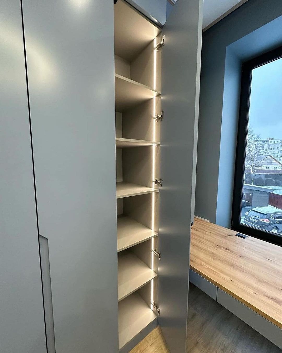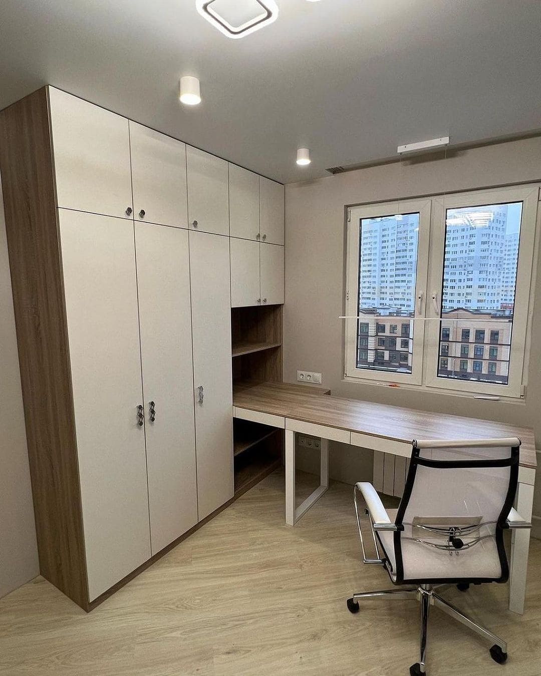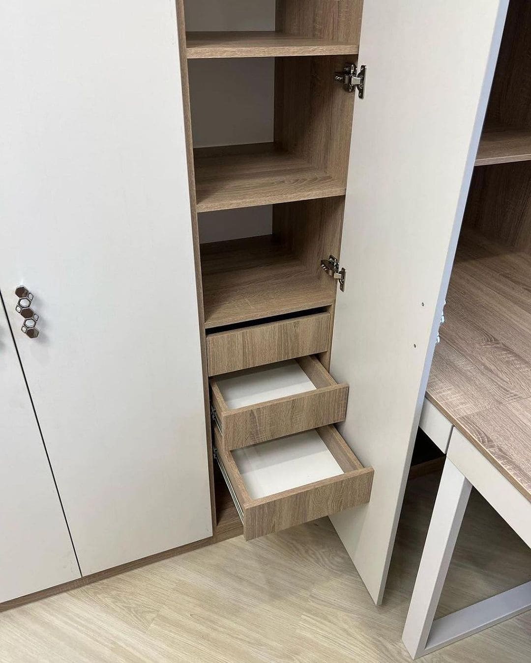 Решили сделать распашной шкаф со встроенным столом, чтобы объединить рабочее место и систему хранения. Получилось очень удобно: в шкафу разместили полки и отделение для одежды, а стол сделали достаточно широким для компьютера и работы. Всё выполнено в одном стиле, поэтому мебель смотрится как единая композиция. Качество сборки хорошее, дверцы открываются плавно, ничего не скрипит. В комнате стало гораздо аккуратнее и удобнее.